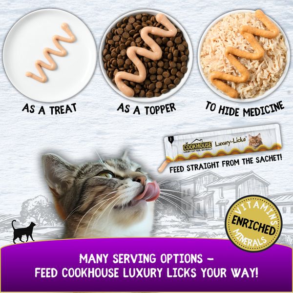 We believe that our cats deserve the very finest treats available, which is why we made the Luxury-Licks range. Carefully crafted and prepared by hand with care, Luxury-Licks are naturally grain & gluten free, contain zero artificial preservatives or colours and contain the perfect blend of taurine & vitamins C & D, meaning they're healthy as well as being delicious. Available in Chicken, Salmon, Tuna or Mixed varieties.