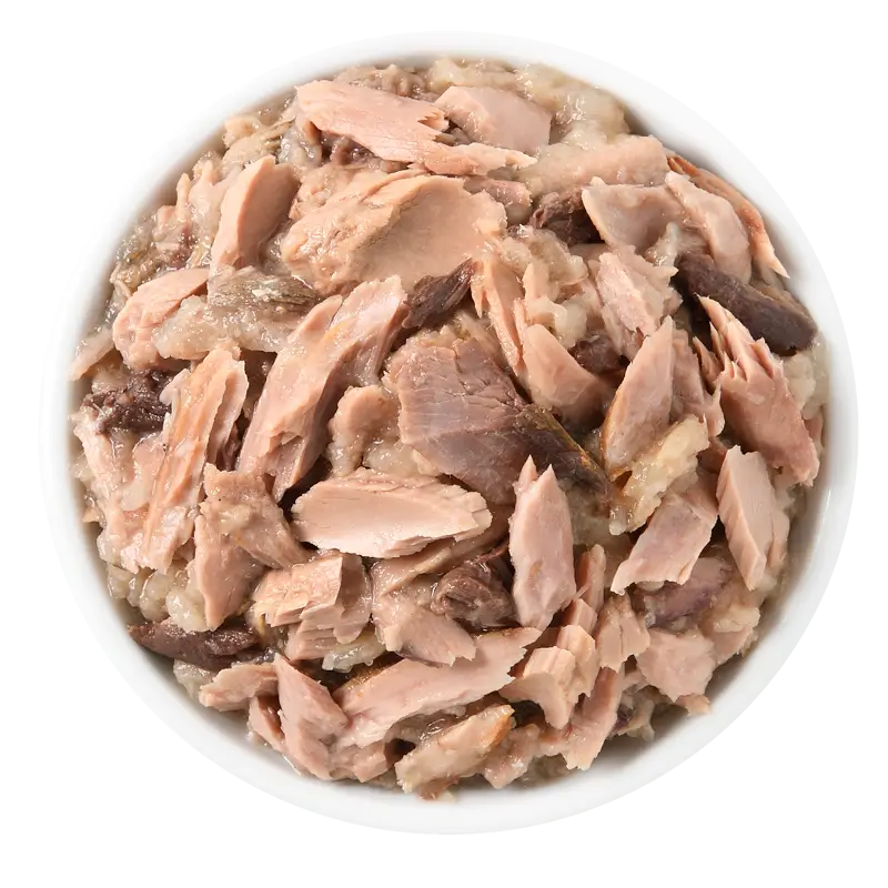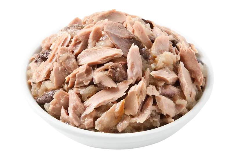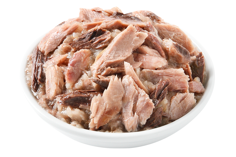 Tuna: Tuna whole loin (48%), sunflower oil, tapioca starch, minerals, tomato paste. Tuna with Sardine: Tuna whole loin (42%), sardine (6%), sunflower oil, tapioca starch, minerals, tomato paste.