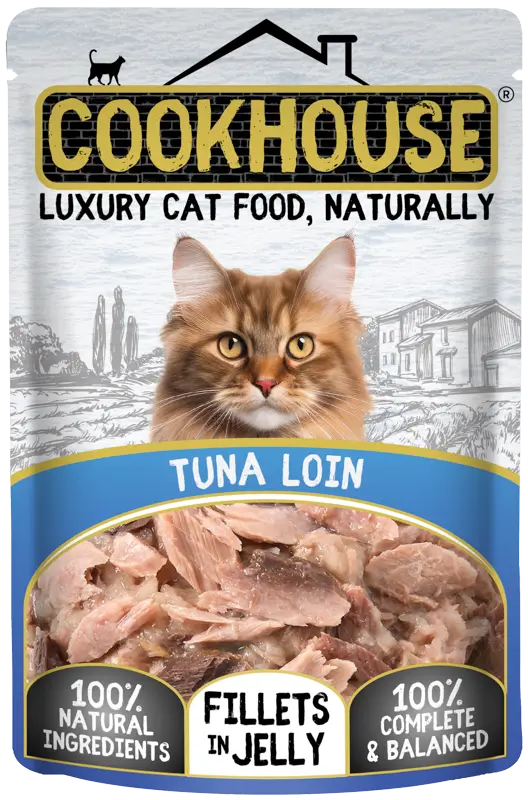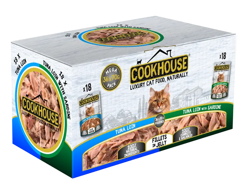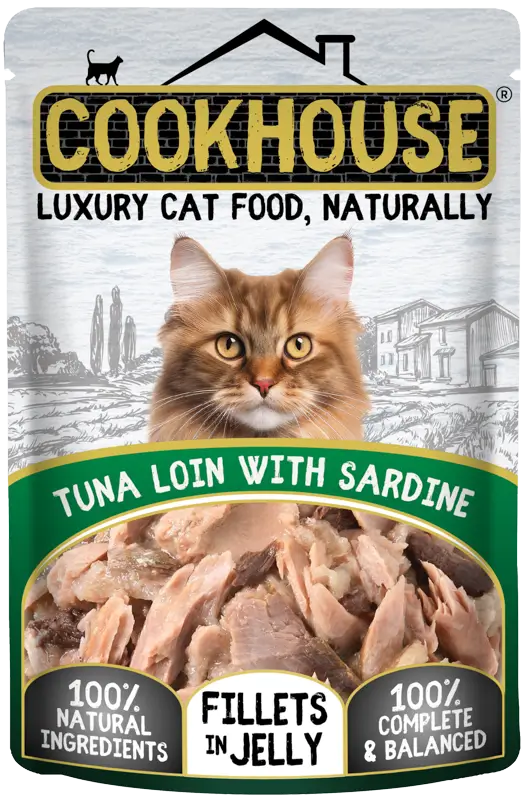 COOKHOUSE Tuna Loin / Tuna Loin with Sardine Fillets in Jelly Multipack is made using the very finest, freshly-prepared 100% natural ingredients, including lots of juicy tuna loin & flakes of sardine fillets. This is then mixed by hand in a light jelly before being gently steam-cooked to just the right consistency for your cat to enjoy. So as well as tasting fantastic to your cat, COOKHOUSE recipes also look good enough for you to eat! Each recipe is also 100% complete & balanced, meaning it supports healthy digestion & contains the perfect combination of vitamins & minerals that your cat needs to enjoy a happy, healthy diet. Suitable for all breeds of adult cats, COOKHOUSE is tasty and healthy in equal measure. It’s Luxury Cat Food, Naturally.